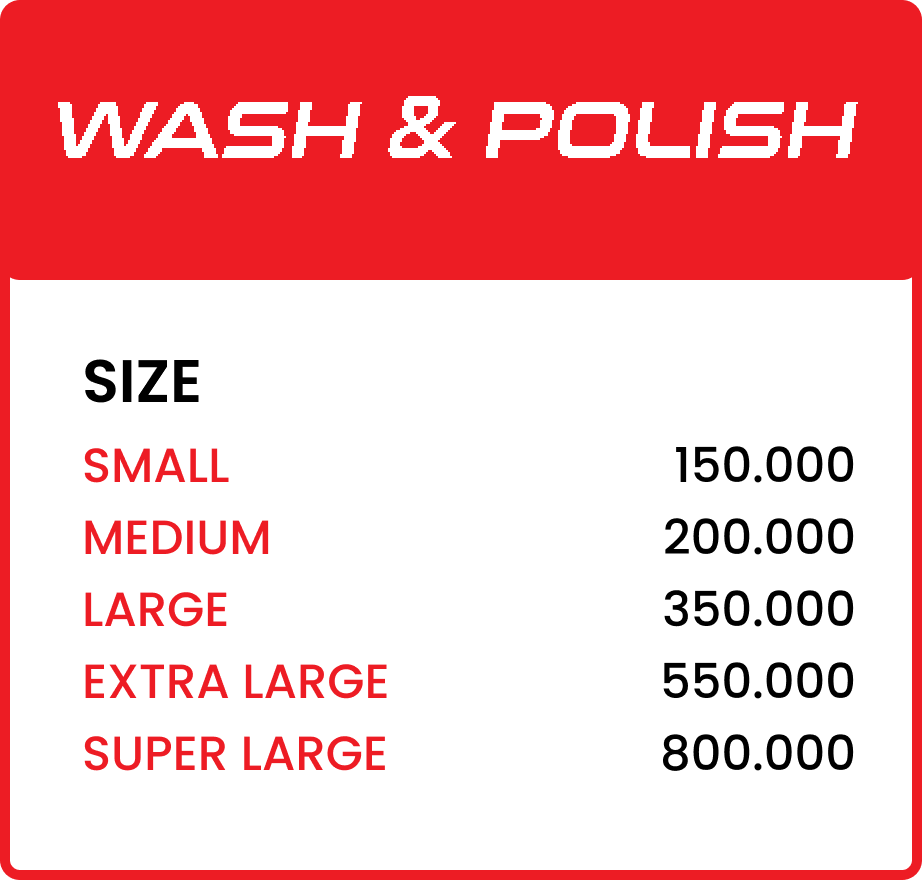 Merupakan jasa cuci premium dan poles bodi motor yang bisa mengangkat kembali warna kembali seperti semula. Prose pengerjaan menggunakan metode yang tidak memberikan efek samping pada bodi seperti getas pada ban atau mengelupas pada bagian bodi motor.